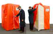 Sized to fit a 48" x 48" x 72" high skid of product, constructed of weatherproof heavy duty orange PVC fabric. Comes with a convenient zipper front so you can remove smaller quantities and zip back up. Clear pouch on the front of the cover so you can insert a product code or label.