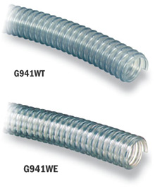 | Construction: | Clear, flexible, food grade PVC supported by a clear, rigid PVC helix. Food grade compound complies with FDA, USDA, and 3-A Sanitary Standards (see Food Section for explanations of applicable standards). G941WE incorporates a copper static wire embedded next to the helix. |