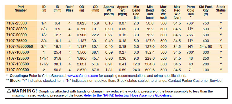 | Note: | Do not use in hot, dry air applications or with refined fuel. The user must determine if the hose is suitable for applications subject to electrical hazard. Contact Parker for additional information. |